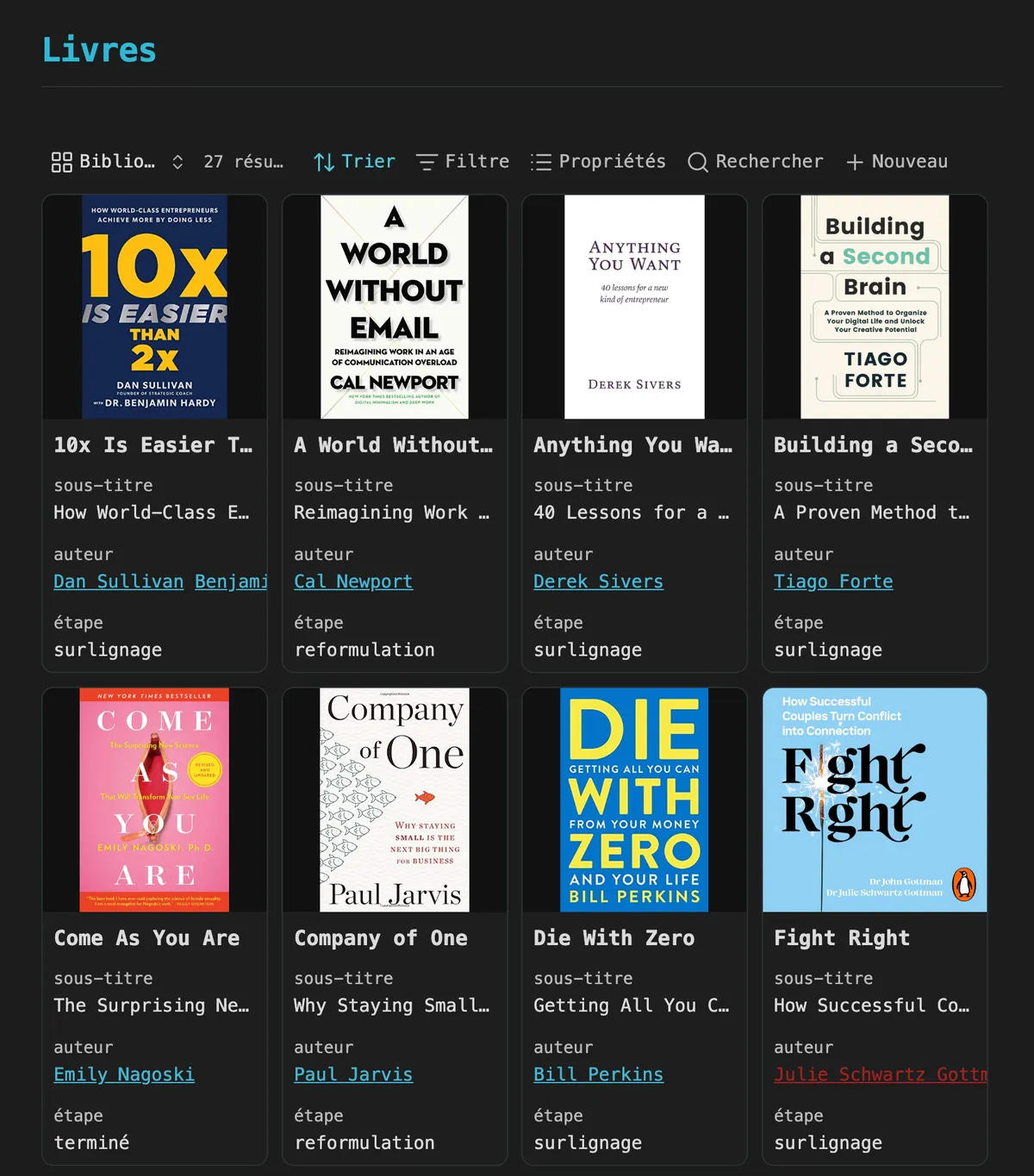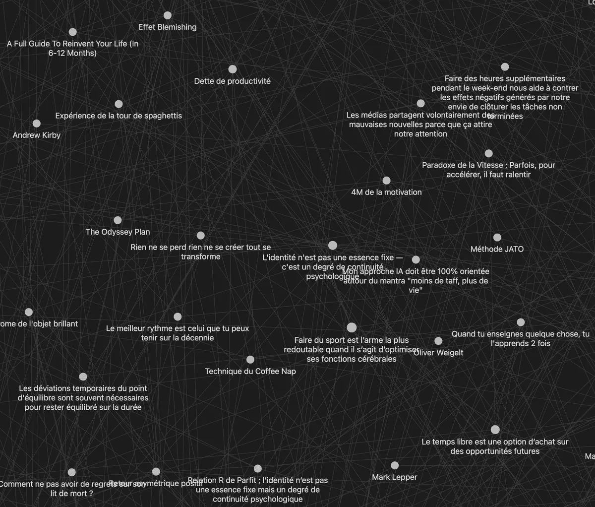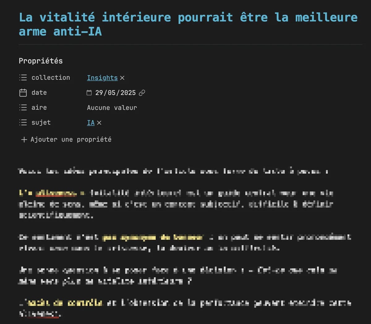 Tu captures des takeaways de livres, des citations d’interviews, des détails de projets.
